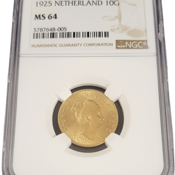 Gouden Wilhelmina 10 gulden 1925 MS64 variant Pearls below IN NGC (pop 59/65) Schaars