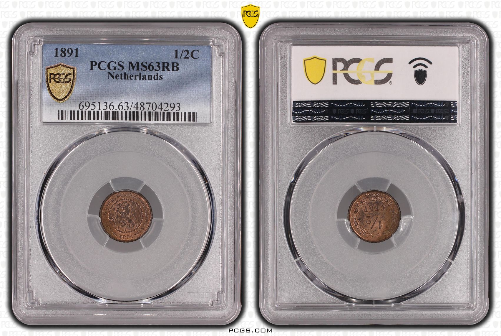 Dit is een door de PCGS gecertificeerde en geslabte bronzen 1/2 cent 1891 Koningin Wilhelmina. De door PCGS bepaalde kwaliteit is MS64 Red Brown. Red Brown houdt in dat de munt nog tussen de 10% en 90 % van zijn originele muntkleur heeft. Deze munt is de eerste munt geslagen onder Koningin Wilhelmina. Wilhelmina was nog maar een meisje van 11 jaar toen deze munt geslagen werd. Haar moeder Koningin Emma was de regentes die de belangen behartigde voor haar dochter na het overlijden van haar man Willem III. Bij PCGS zijn er maar 2munten in deze kwaliteit (én 1 van die exemplaren verkopen wij). Bij PCGS zijn er 12 munten bekend in een betere kwaliteit.