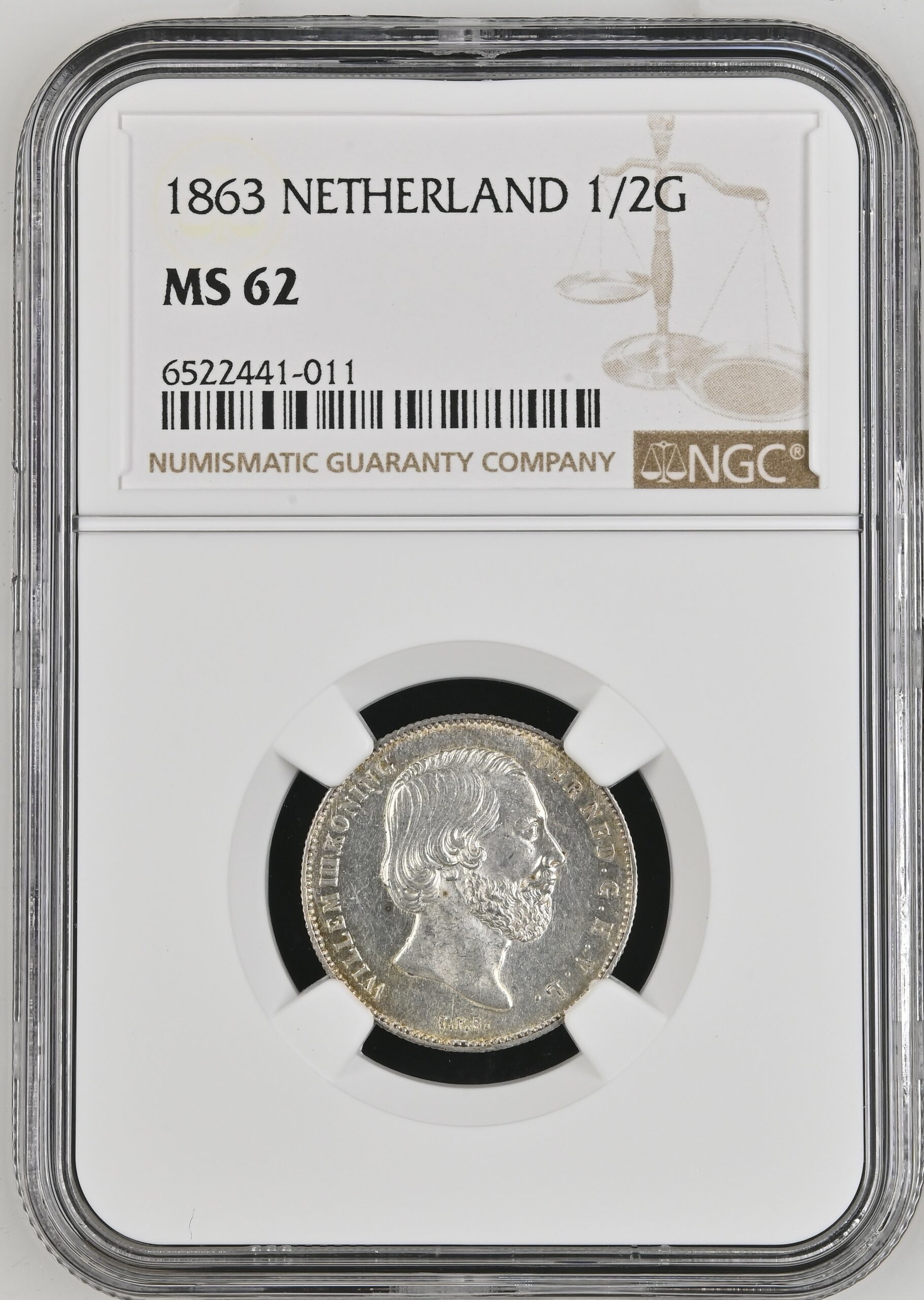 De door NGC gecertificeerde Koning Willem III – halve gulden uit 1863, beoordeeld als MS62, met slechts twee exemplaren bekend in deze kwaliteit.