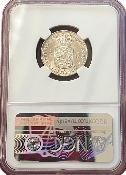 Dit is een door de NGC gecertificeerde en geslabte zilveren halve gulden 1898 Koningin Wilhelmina. De door NGC bepaalde kwaliteit is MS62. Bij NGC zijn er maar 2 munten in deze kwaliteit geslabbed. Er zijn door NGC 5 munten geslabbed in een hogere score. Het jaartal 1898 is het jaar dat Wilhelmina 18 jaar oud werd en gekroond tot Koningin. Tot die tijd nam haar moeder Koningin Emma als regentes de honneurs waar.