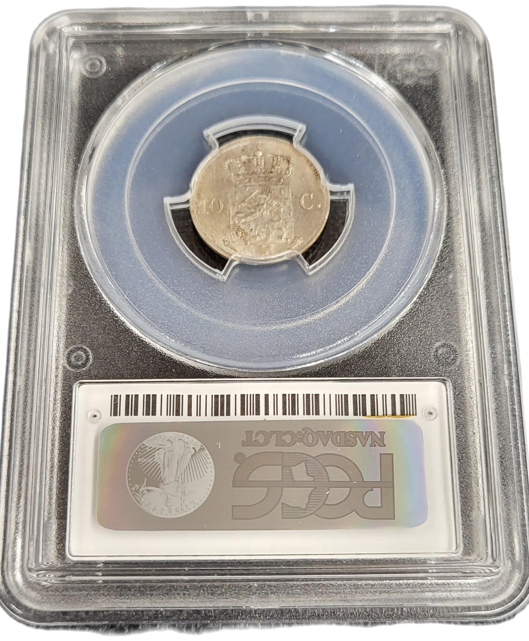 Dit is een door de PCGS gecertificeerde en geslabde zilveren dubbeltje / 10 cent 1827 Utrecht van Koning Willem I. De door PCGS bepaalde kwaliteit is MS64. Bij PCGS zijn er 8 munten in deze kwaliteit geslabd en 2 van deze verkopen wij. Er zijn door PCGS 20 munten geslabd in een hogere MS score. U krijgt één van onderstaande munten geleverd.