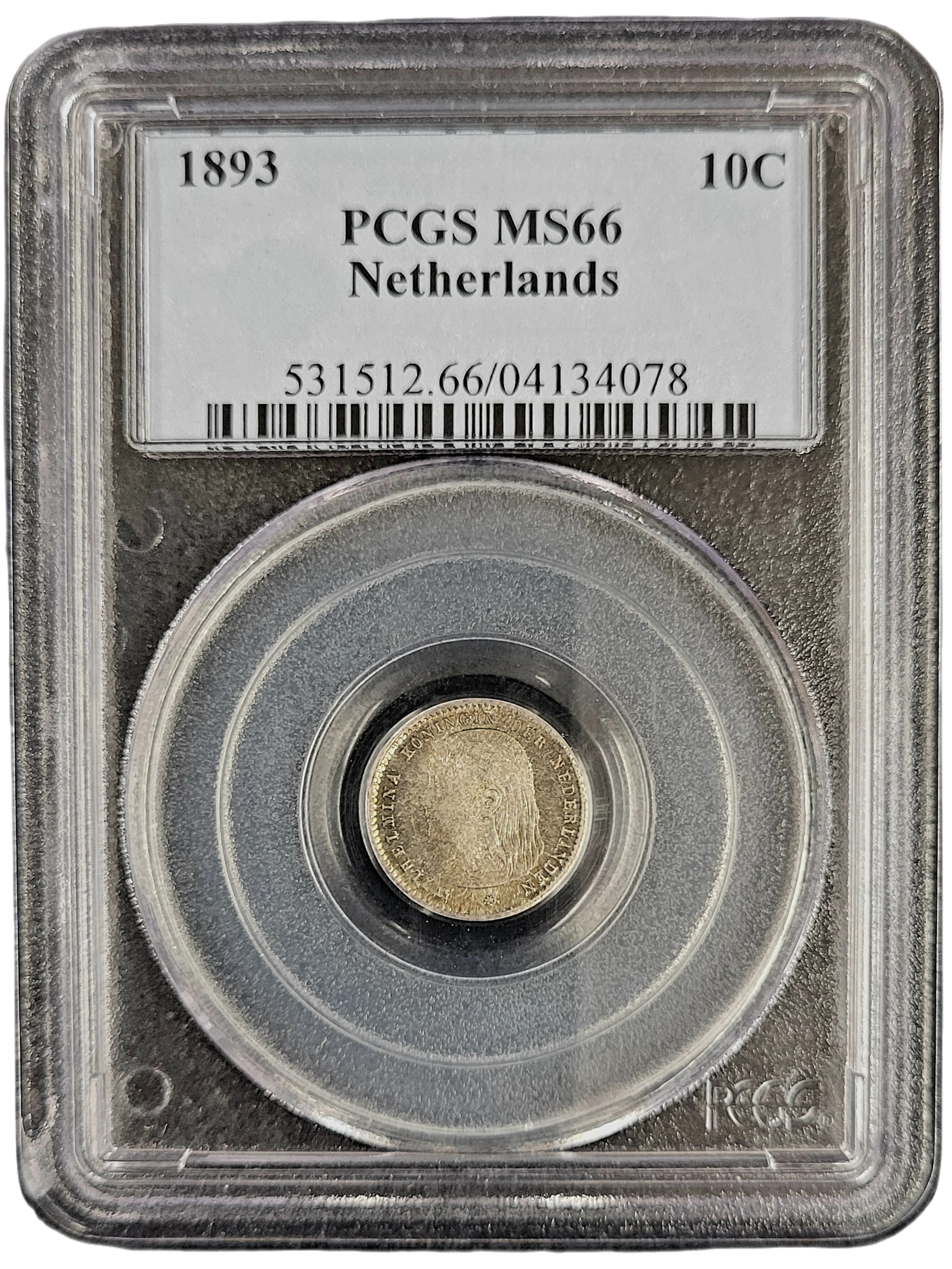 Dit is een door de PCGS gecertificeerde en geslabde zilveren 10 cent 1893 MS66 geslagen onder het heerschap van Koningin Wilhelmina (regentes Koningin Emma). De door PCGS bepaalde kwaliteit is MS66. Bij PCGS zijn er 9 munten in deze kwaliteit geslabd. Er zijn door PCGS 4 munten geslabd in een hogere MS score. De oplage van het jaar 1893 is 2.000.000 stuks. Een zeer mooie munt met authentieke patina in vroege pcgs slab!
