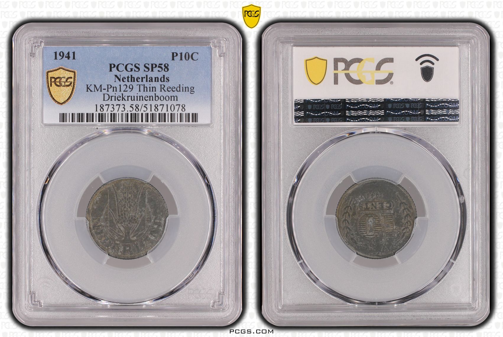 Dit is een door de PCGS gecertificeerde en geslabde zinken 10 cent 1941 Driekruinenenboom met fijne kartelrand. De door PCGS bepaalde kwaliteit is AU58. Bij PCGS is er 1 munt in deze kwaliteit geslabd. Er zijn door PCGS 3 munt geslabd in een hogere SP score.