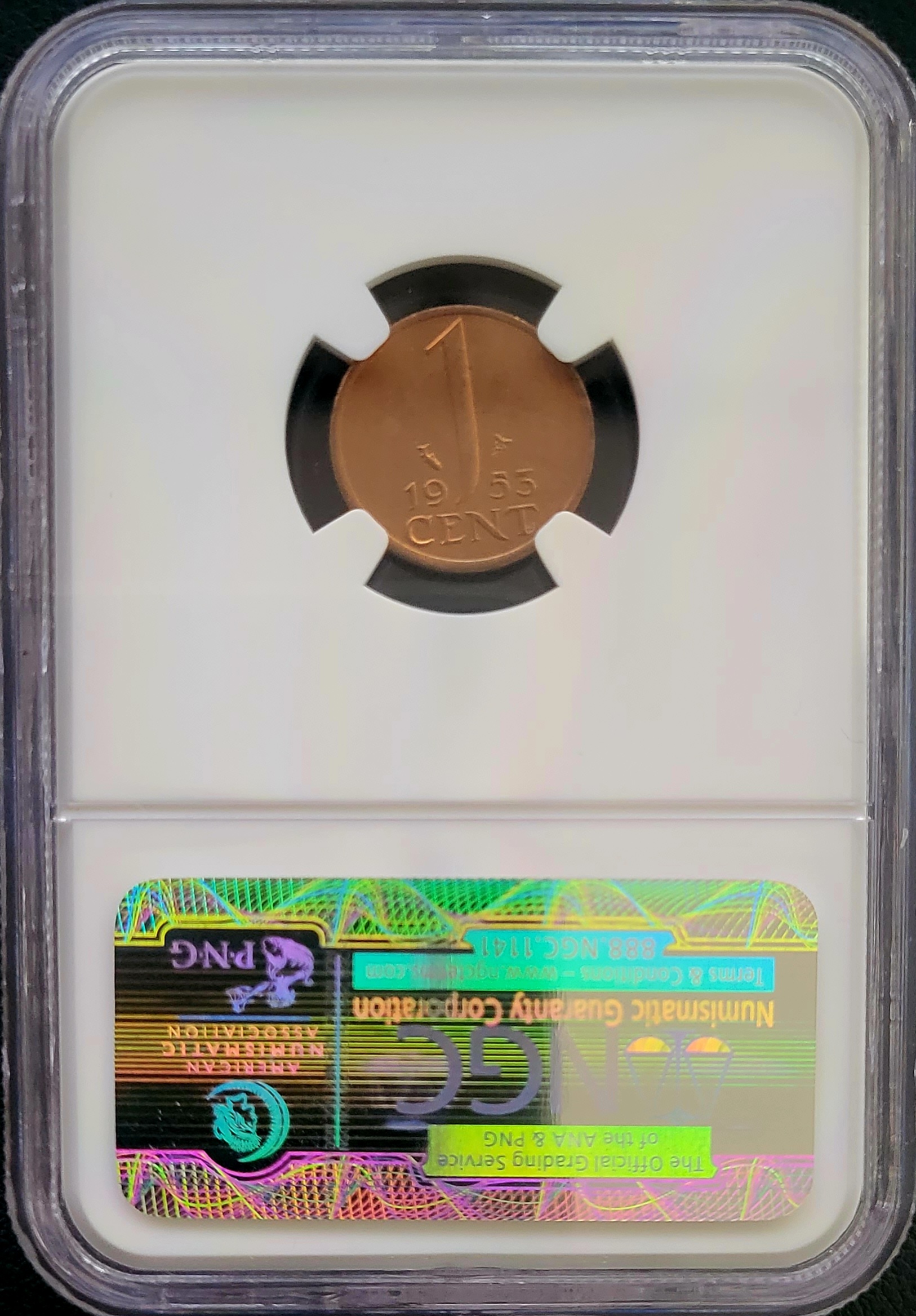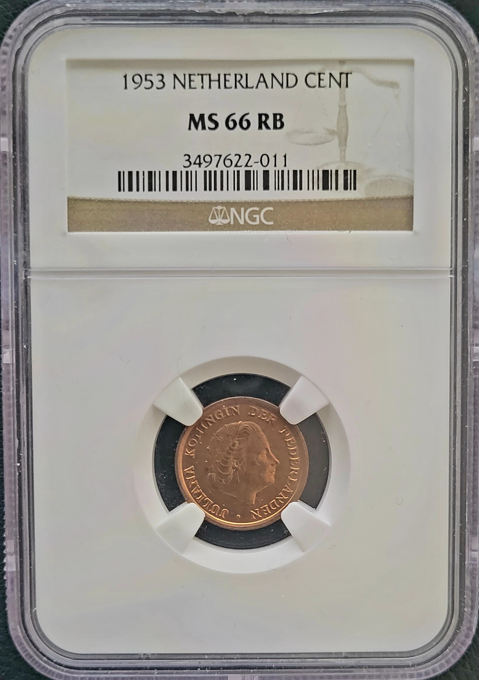 Dit is een door de NGC gecertificeerde en geslabte bronzen 1 cent 1953 Koningin Juliana. De door NGC bepaalde kwaliteit is Mintstate 66 Red Brown (MS66 RB). Bij NGC is dit de enige munt in deze kwaliteit geslabd. Er is door NGC geen munt geslabd in een hogere MS score. Wij verkopen dus het allerbeste en allermooiste exemplaar die door NGC is geslabd.
