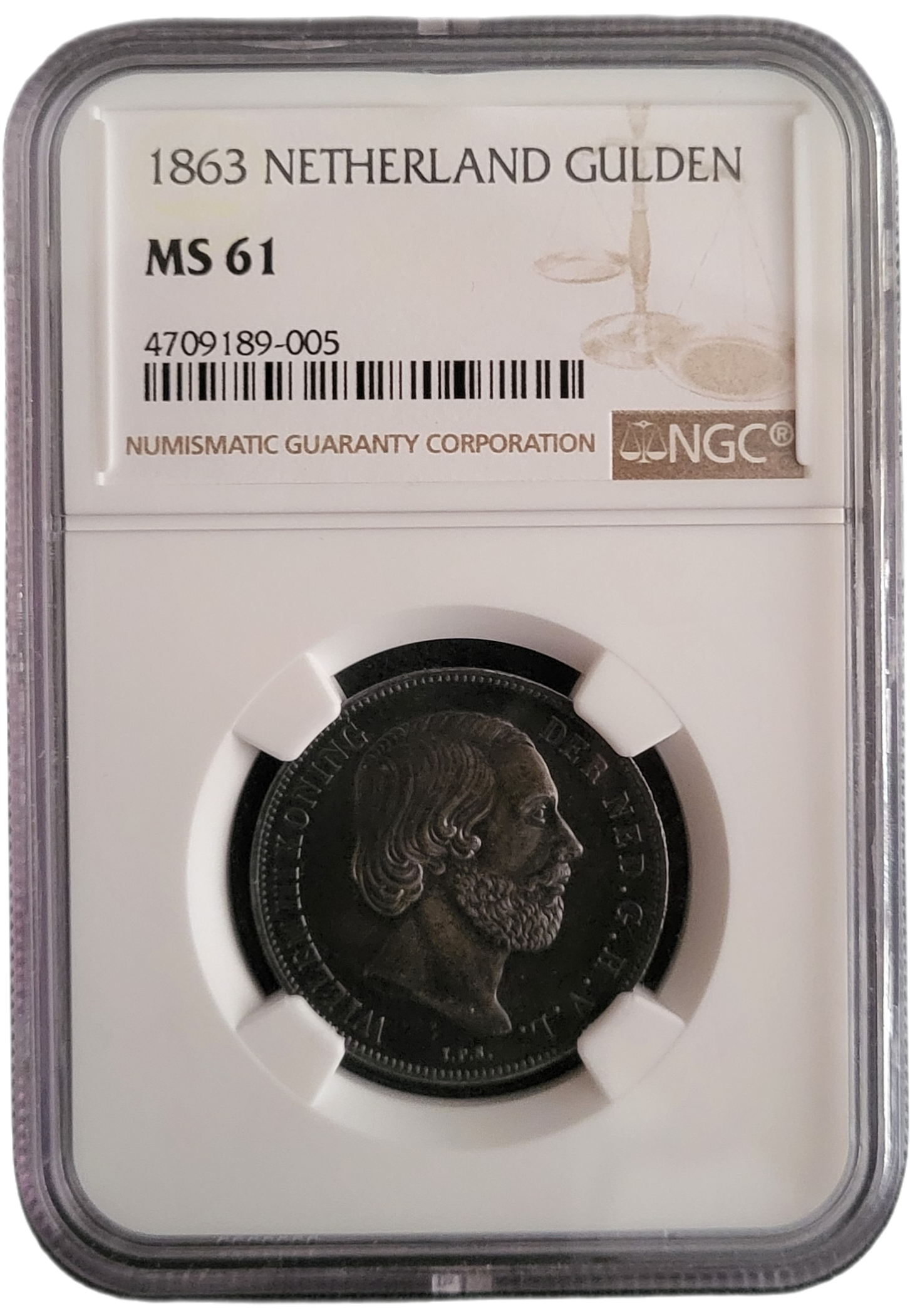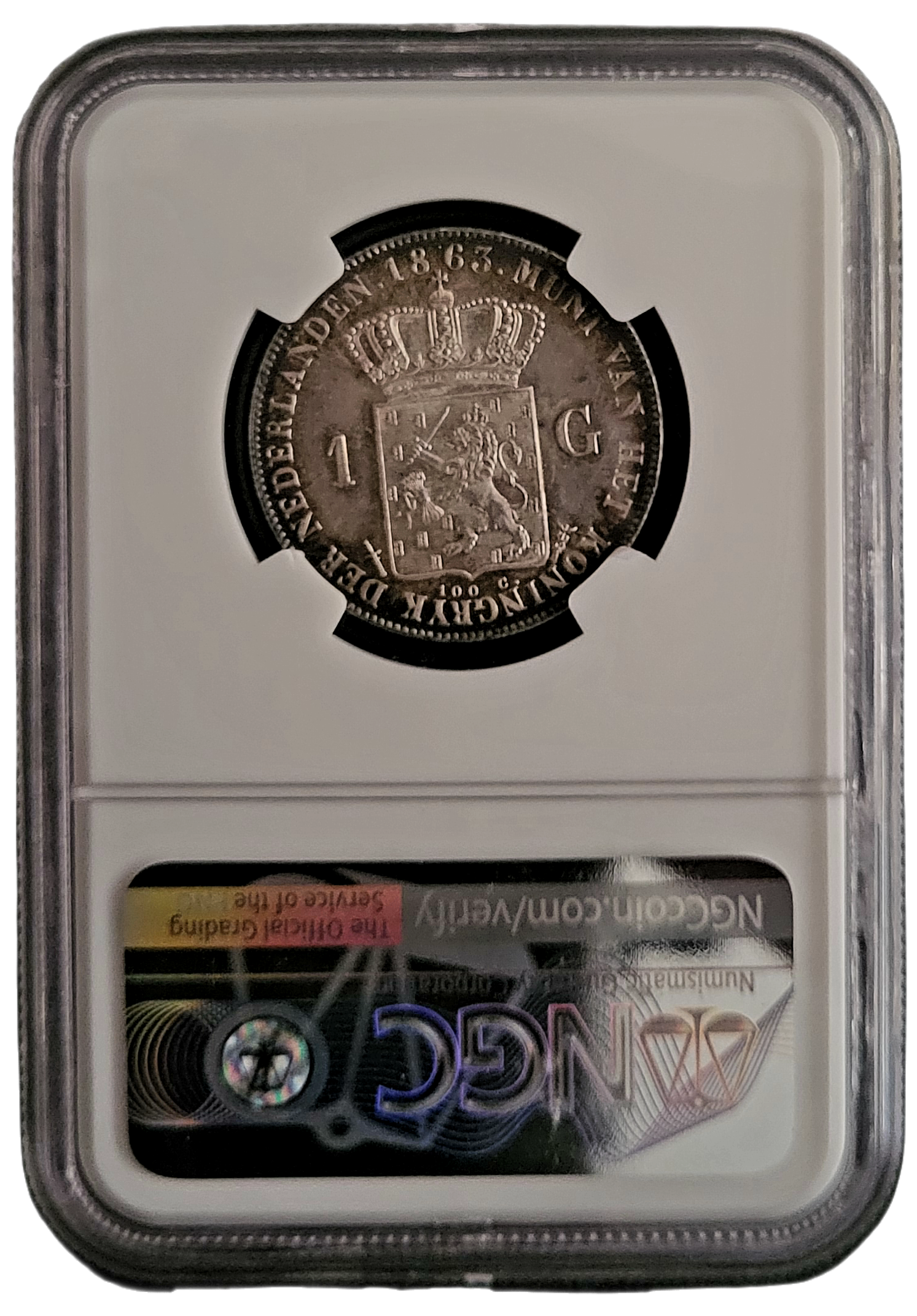 Deze gulden 1863 is geslagen in Utrecht met Willem III als Koning der Nederlanden. De door NGC bepaalde kwaliteit is MS61. Deze mooie gulden 1863 heeft een aantrekkelijke patina ontwikkeld, maar heeft ook de originele glans van zilver “de mattere kleur zilver” wat aangeeft dat deze gulden 1863 nimmer gereinigd is geweest. Bij NGC is er 1 gulden 1863 in deze kwaliteit gecertificeerd. Er zijn door NGC 3 munten gecertificeerd met een hogere MS score.