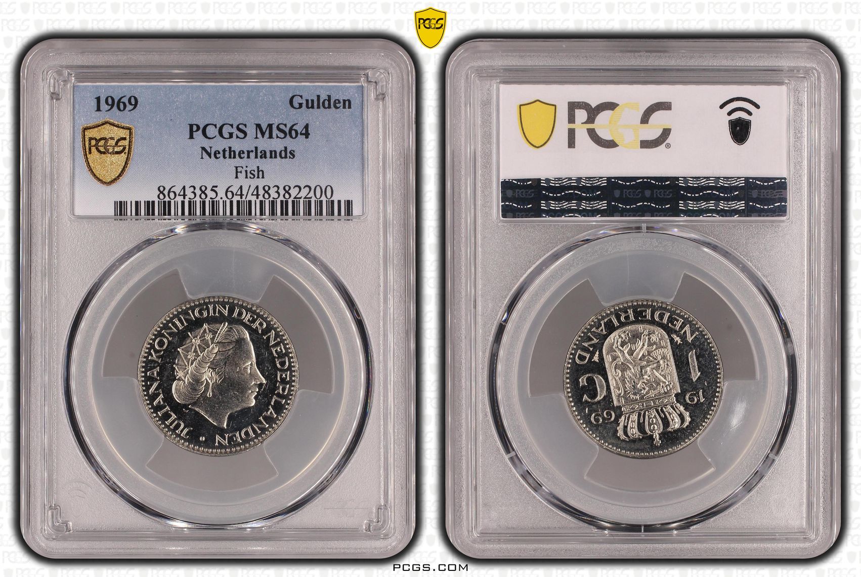 Dit is een door de PCGS gecertificeerde en geslabte 1 gulden 1969 vis van Koningin Juliana. De munt heeft een prooflike uitstraling, gematteerd hoofd en letters (vroege afslag). De door PCGS bepaalde kwaliteit is MS64. Bij PCGS is er maar 1 munt in deze kwaliteit (dit exemplaar). Bij PCGS zijn er maar 2 munten bekend in een betere kwaliteit. Deze vroege jaren guldens in nikkel zijn zeer lastig te vinden in hoge kwaliteit.
