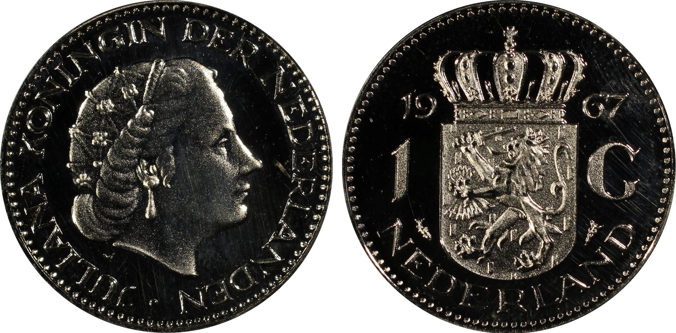 Dit is een door de PCGS gecertificeerde en geslabte nikkelen versie van de 1 gulden 1967 Proof van Koningin Juliana. De door PCGS bepaalde kwaliteit is PROOF 65. Dit exemplaar is de enige munt bij PCGS in deze kwaliteit zonder de toevoeging Cameo of Deep Cameo. Bij PCGS is er slechts 1 munt bekend in deze staat van dit jaartal en geen betere.