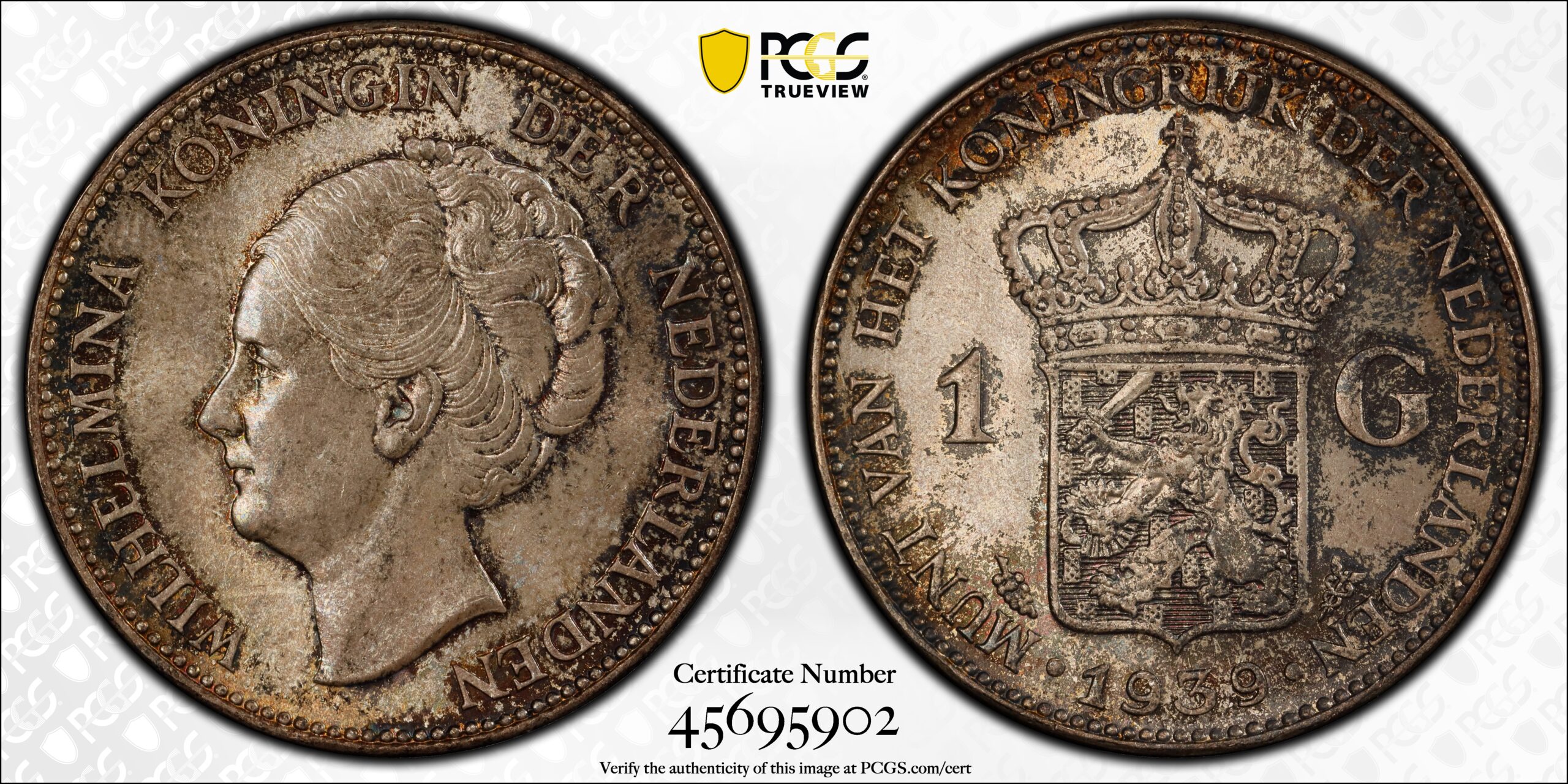Deze door de PCGS gecertificeerde 1 gulden 1939 van Koningin Wilhelmina heeft een door PCGS bepaalde kwaliteit van MS64. Bij PCGS zijn 8 munten in deze kwaliteit geslabbed. Er zijn door PCGS 2 munten in een hogere MS score gecertificeerd.
