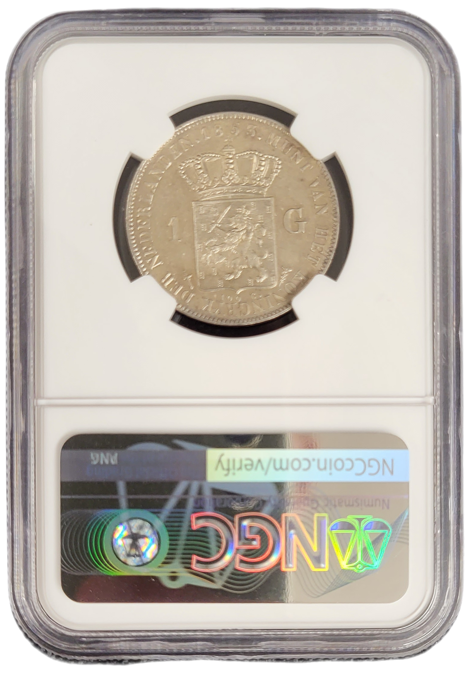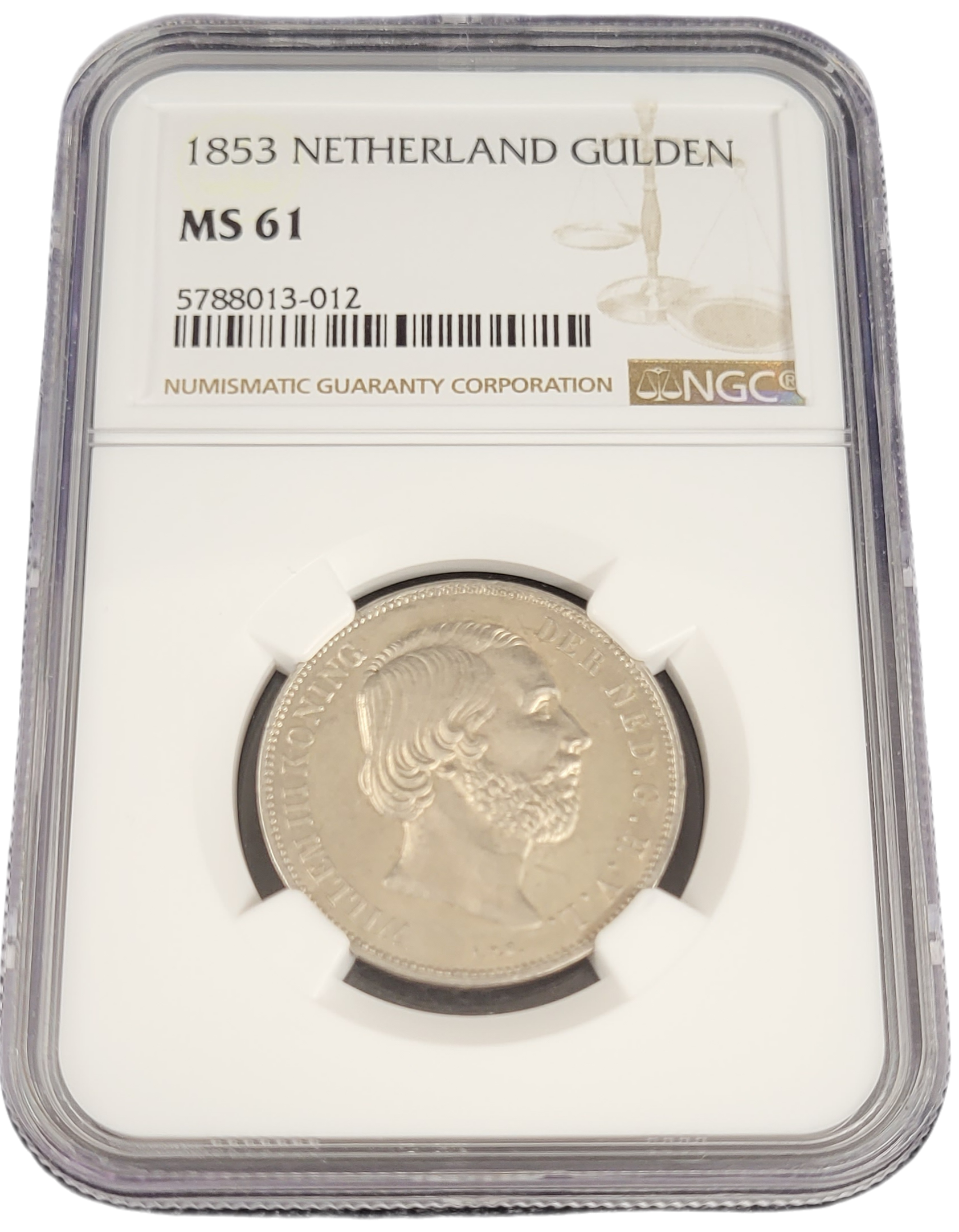 Deze zeldzame 1 gulden 1853 is geslagen in Utrecht met Willem III als Koning der Nederlanden. De door NGC bepaalde kwaliteit is MS61. Deze 1 gulden 1853 heeft de kleinste oplage qua roulatiemunten met 652.035 stuks, verdeeld over 3 stempelvarianten. Bij NGC zijn er twee keer 1 gulden 1853 in deze kwaliteit gecertificeerd. Er zijn door NGC geen munten gecertificeerd met een hogere MS score.