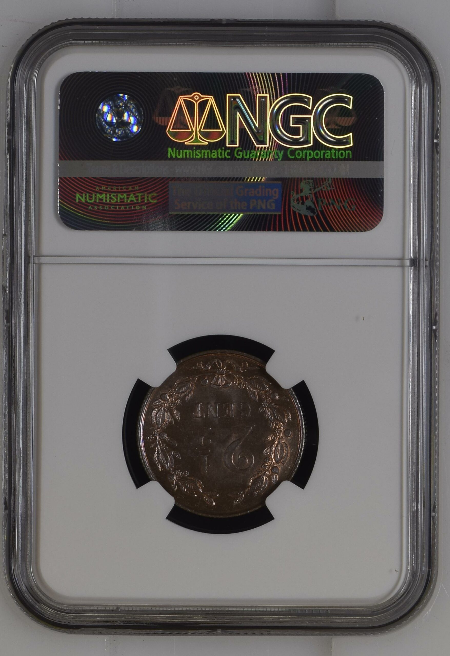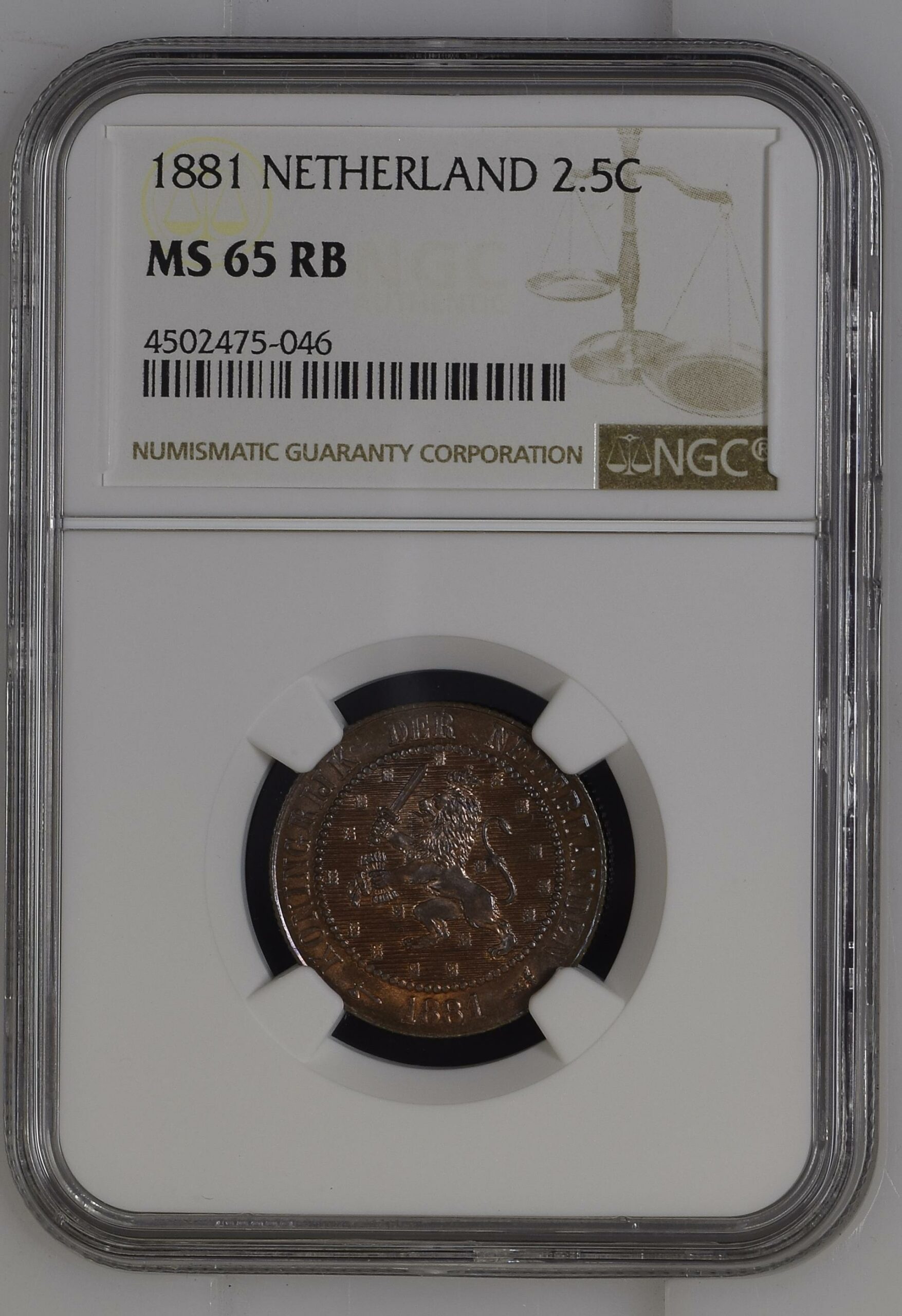 Deze 2 1/2 cent 1881 van Koning Willem III is door NGC gecertificeerd en geslabd in een MS65 RB ( Red Brown). Bij NGC zijn er 3 munten in deze kwaliteit geslabd. Er zijn door NGC geen munten in een hogere MS score gecertificeerd.