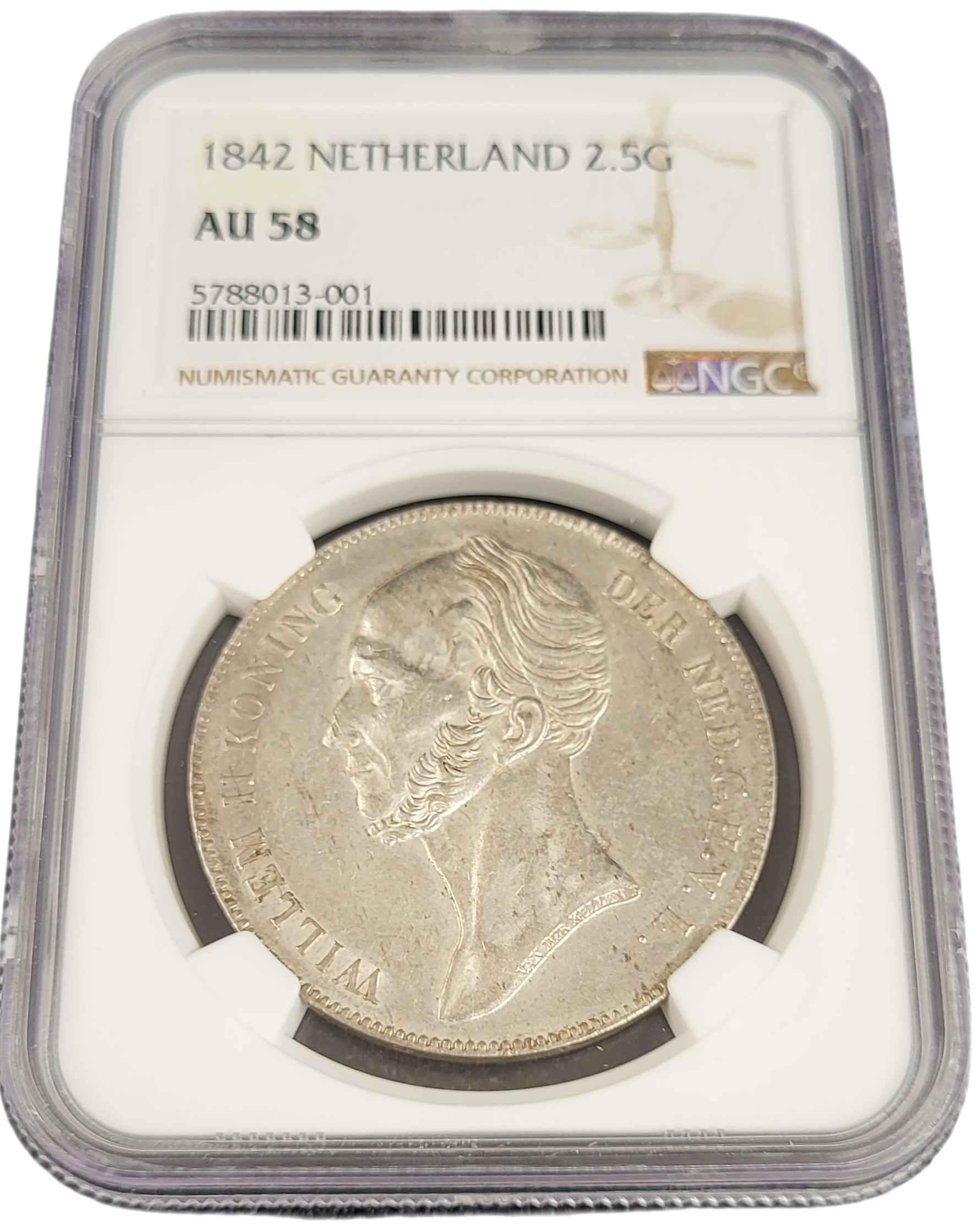 Deze rijksdaalder 1842 welke door NGC is gecertificeerd en in een slab geplaatst, heeft de kwaliteit AU58. Bij NGC zijn er slechts twee munten in deze kwaliteit gecertificeerd, beide bij 101munten op voorraad. Bij NGC is er maar 1 munt bekend met een hogere certificering. De 2 1/2 guldens van Willem II hebben een gewicht van 25 gram en een zilvergehalte van 945/1000 zilver. Het is zeer lastig om grote munten zoals guldens en rijksdaalders in mintstate te vinden en gecertificeerd te krijgen. Veel munten zijn in het verleden gepoetst en daardoor verkeerd behandeld, zodat ze bij grading het label krijgen met Detail (Cleaned). De structuur van het portret is zeer scherp, zoals u zelden munten ziet uit deze periode, naar onze mening zijn de munten redelijk streng afgerekend en zijn ze minstate waardig.
