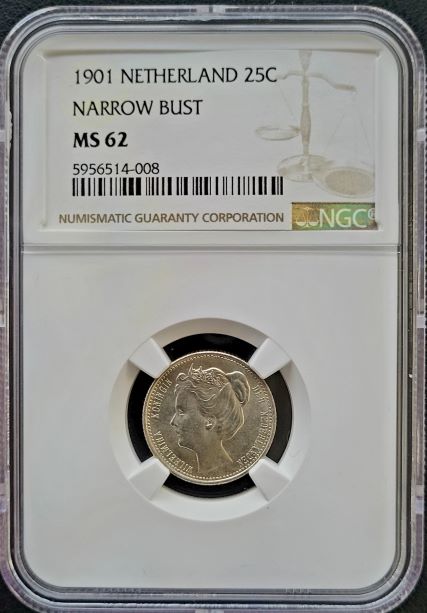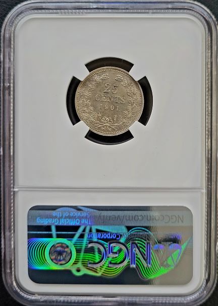 Dit is een door de NGC gecertificeerde en geslabte zilveren 25 cent 1901Smalle Hals (Narrow Bust) van Koningin Wilhelmina. De door NGC bepaalde kwaliteit is MS62. Bij NGC zijn er maar vier munten in deze kwaliteit geslabbed en éen van die verkopen wij! Er zijn door NGC 9 munten geslabt in een hogere MS score. Hiermee is dit een betaalbare, maar toch erg mooie 25 cent 1901 Smalle Hals