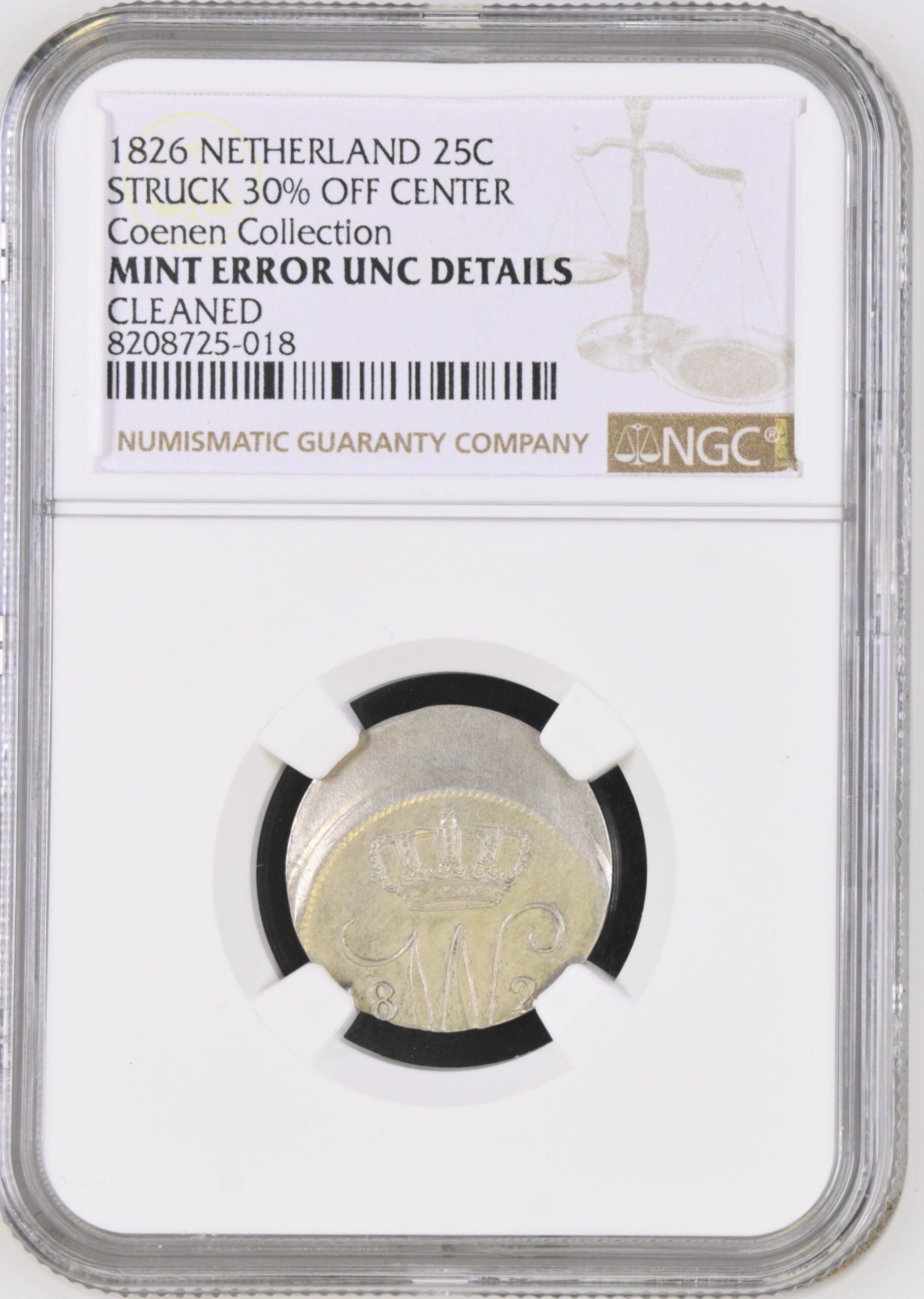 Koning Willem I 25 Cent 1826 Utrecht – Misslag (30% Off Center) – NGC UNC Details – Ex Coenen Collectie
