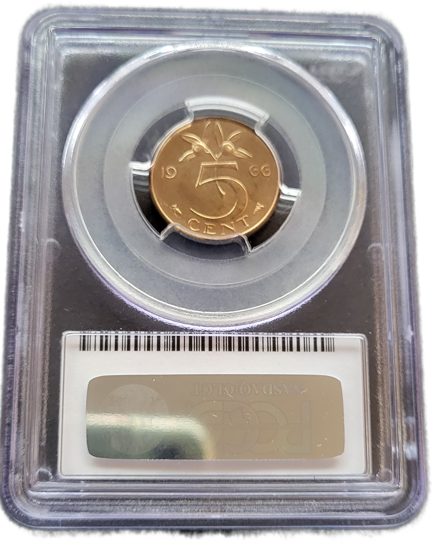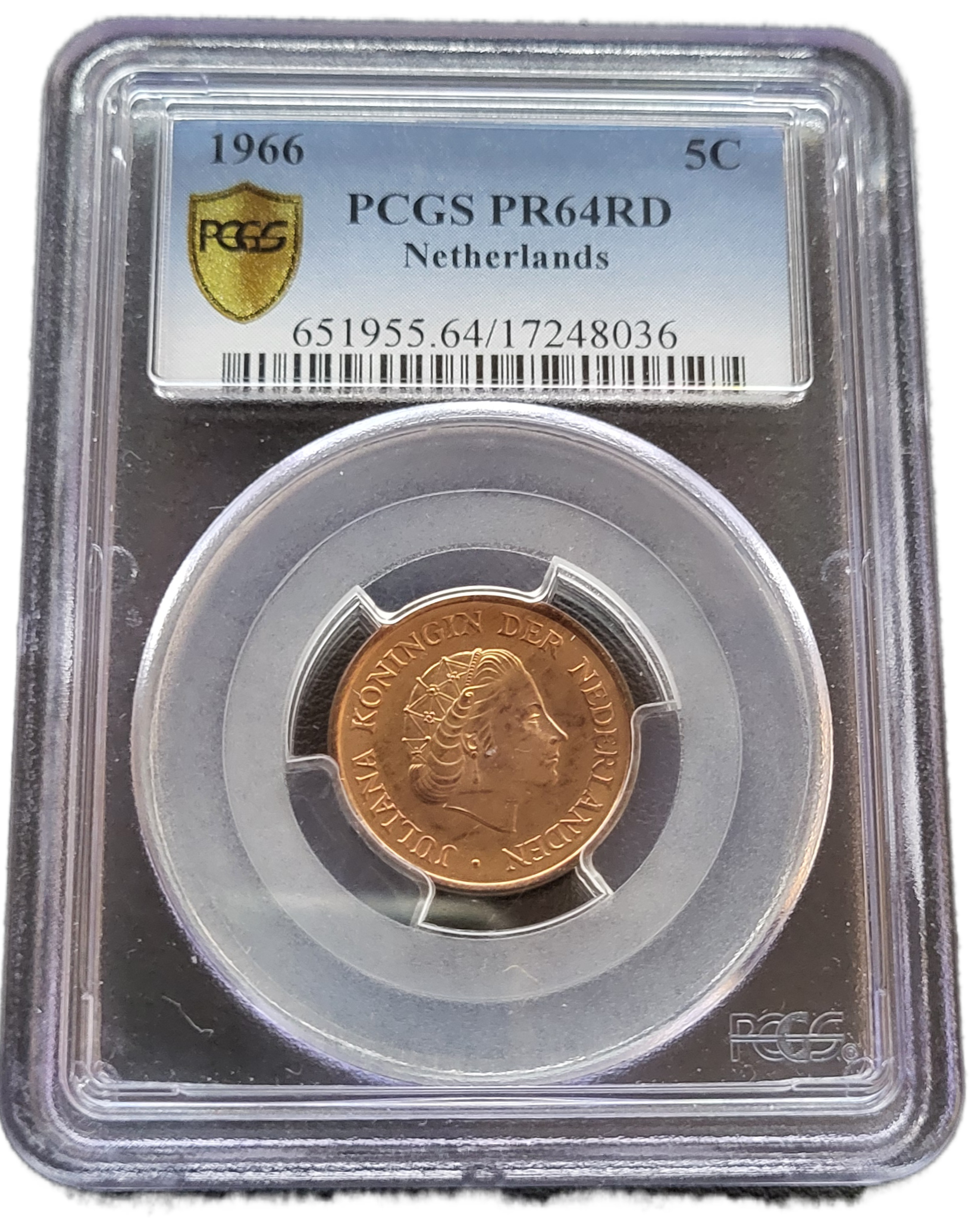 Dit is een door PCGS gecertificeerde en geslabde bronzen 5 cent munt uit 1966 met het portret van Koningin Juliana. Deze proof munt is geslagen met een gepolijste stempel op een gepolijst muntplaatje, wat resulteert in een schitterend spiegelend oppervlak. De kwaliteit van de munt is door PCGS vastgesteld op PR64RD. Bij PCGS is er slechts één munt in deze kwaliteit geslabd, dit specifieke exemplaar. Er is slechts één munt met een hogere Proof Red score. Proofmunten van Juliana worden vaak in zeer beperkte oplages van maximaal 60 stuks geslagen.