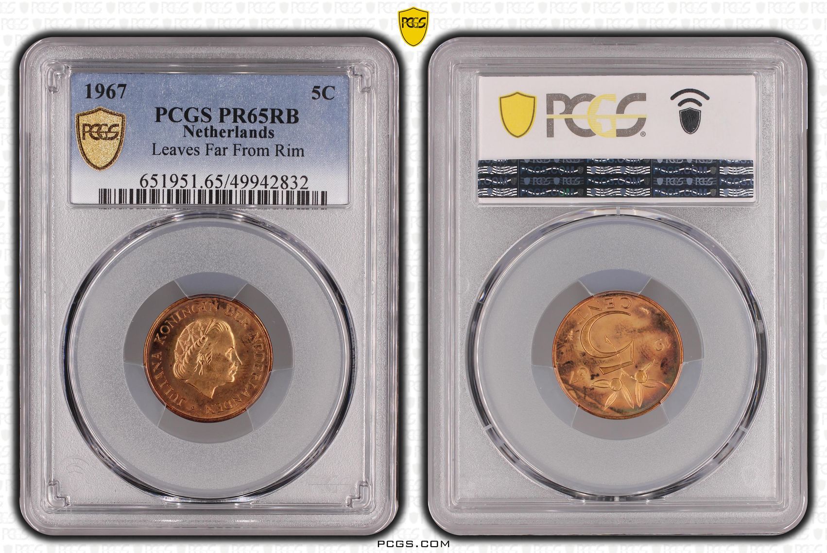 Dit is een door PCGS gecertificeerde en geslabde bronzen 5 cent munt uit 1967 met het beeltenis van Koningin Juliana. Deze proof munt is geslagen met een gepolijste stempel op een gepolijst muntplaatje, wat zorgt voor een bijzonder glanzend resultaat. De kwaliteit van de munt is door PCGS vastgesteld op PR65RB. Er zijn wereldwijd slechts vier munten in deze kwaliteit geslabd door PCGS, en er zijn geen munten welke een hogere Proof Red Brown score hebben. Oftewel Top Pop! Alle 5 cent 1967 proof munten zijn geslagen met de variatie “Leaves Far From Rim!