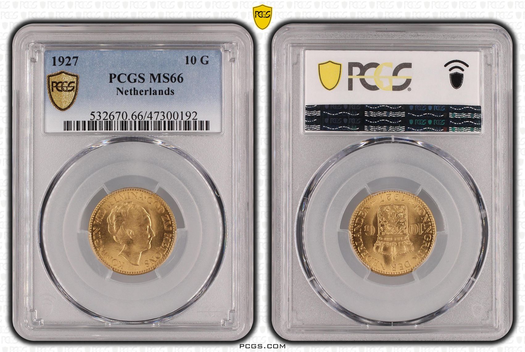 Dit is een door de PCGS gecertificeerde en geslabte Gouden 10 gulden 1927 MS66 van Koningin Wilhelmina. De door PCGS bepaalde kwaliteit is MS66. Bij PCGS zijn er 28 tientjes in MS66 gekwalificeerd en slechts 10 stuks hoger. Met een oplage van 1.000.000 stuks is dit een lastigere tientje om te vinden een hoge kwaliteit!