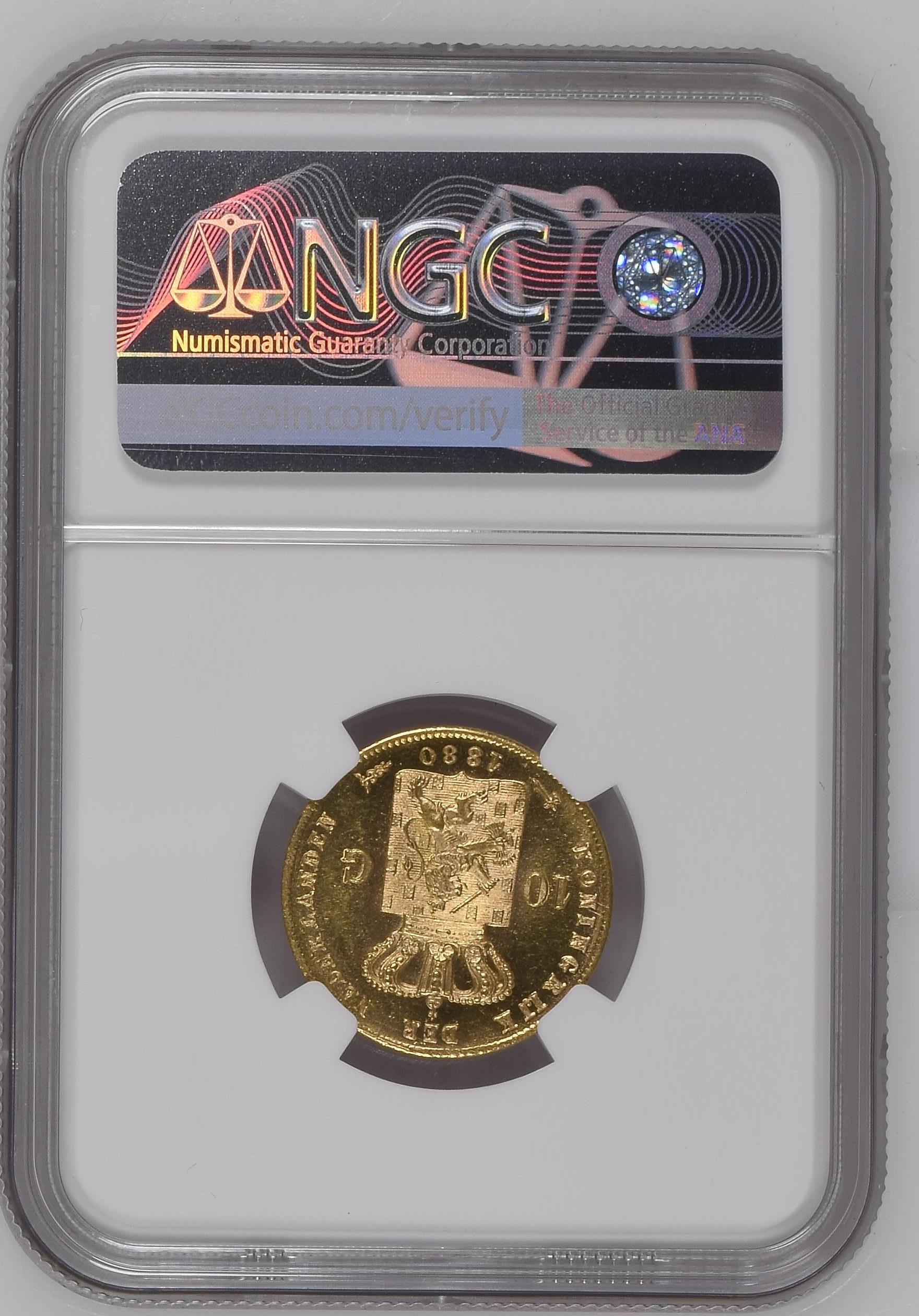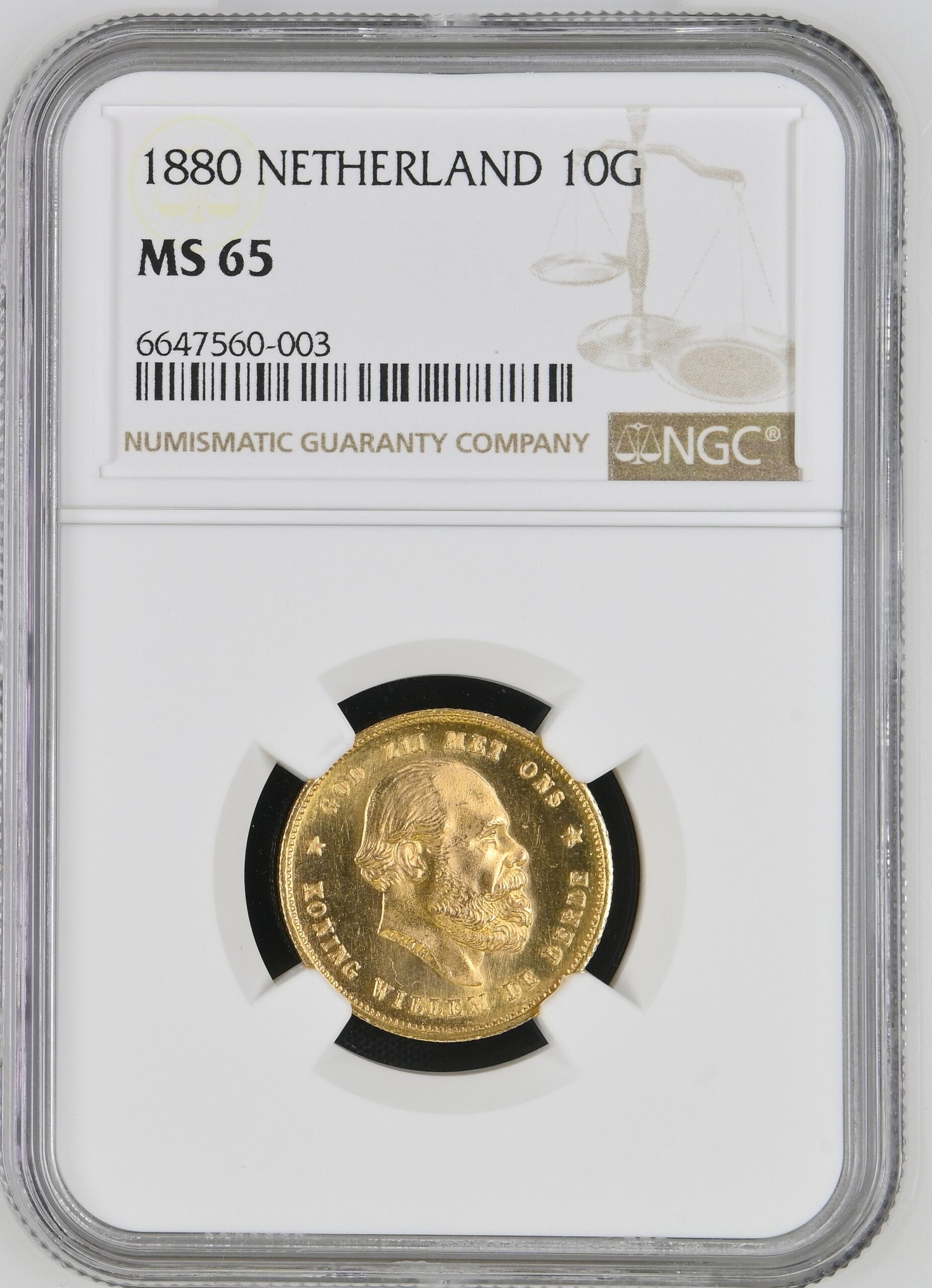 Dit is een door de NGC gecertificeerde en geslabte Gouden 10 gulden 1880 MS65 (gouden tientje) van Koning Willem III. De door NGC bepaalde kwaliteit is MS64. Bij NGC zijn 16 munten in deze kwaliteit en er zijn 57 munten die door NGC zijn gegrade in een hogere kwaliteit. De totale oplage van 1880 is slechts 50.100 stuks.