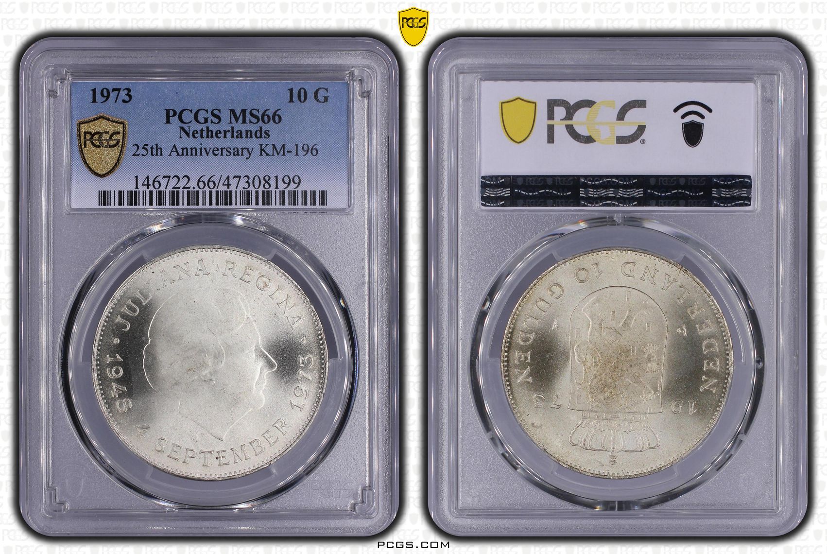 Wij hebben (hadden) 4 munten van de 10 gulden 1973 Jubileum MS66 op voorraad, u kunt via het certificaatnummer extra informatie vinden over de munt.
