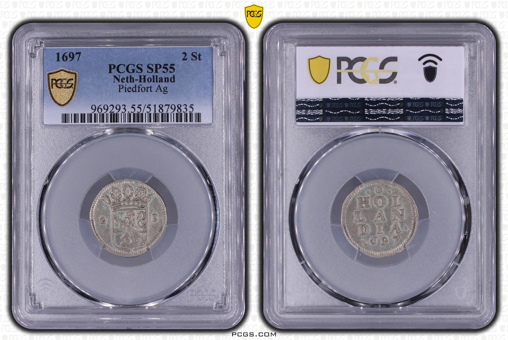 De Hollandse dubbel wapenstuiver is als circulatie munt uitgegeven in de periode 1672 t/m 1793. Er is slechts 1 jaar uitgegeven in Piedfort, dit jaar 1697. Wij hebben deze zeer zeldzame Piedfort assortiment. Met een certificering van PCGS als AU55 en een populatie van 1 in deze kwaliteit, met slechts 1 munt hoger gecertificeerd, is dit een Unieke vondst.