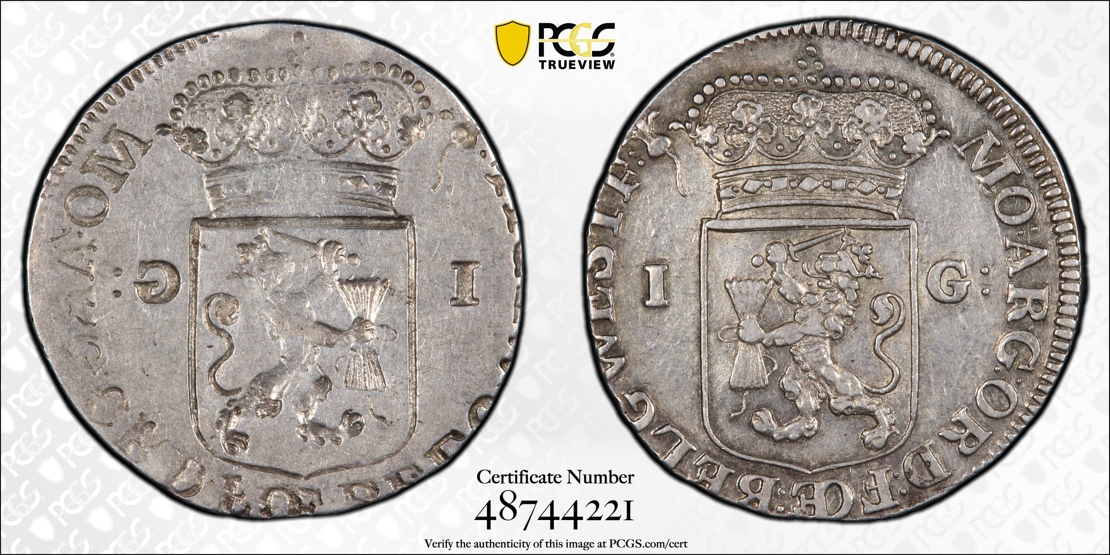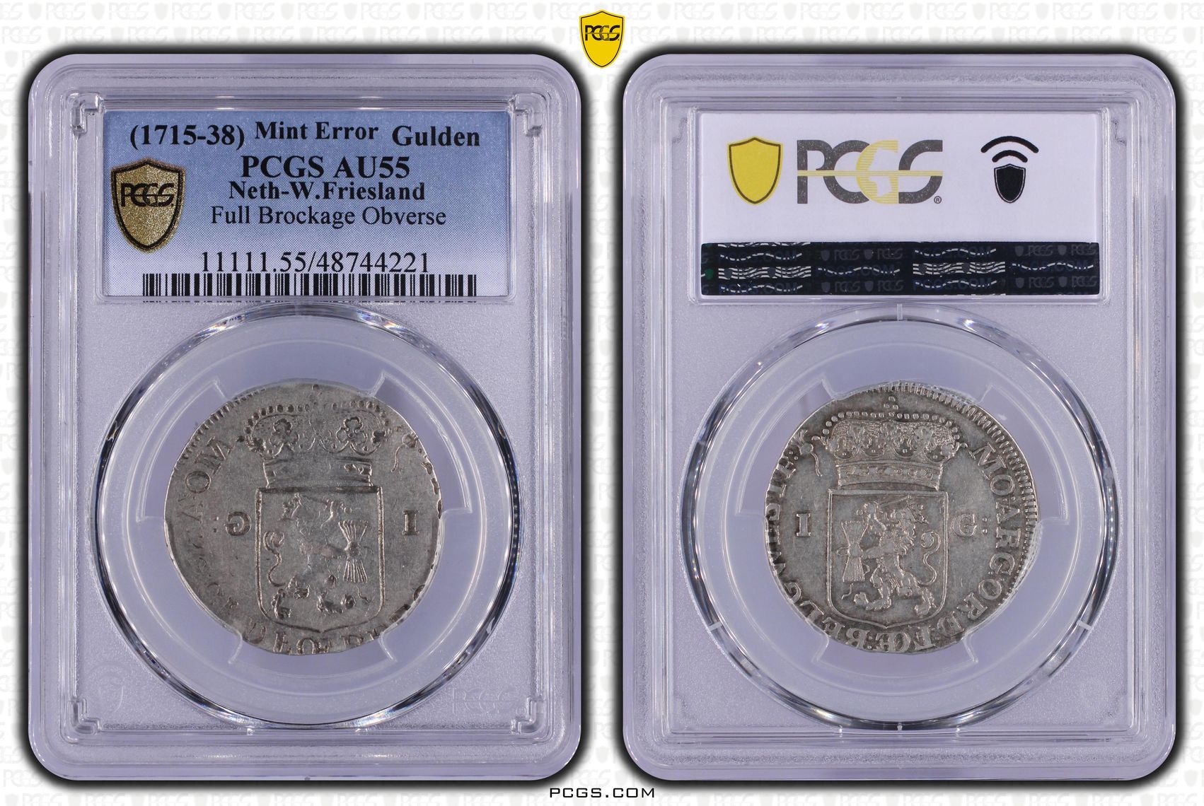 Een indrukwekkende misslag 1 gulden munt uit de periode van de Generaliteitsmunten: deze Provincie West-Friesland 1 Gulden (1715–1738) is een zeldzame en spectaculaire brockage-misslag, gecertificeerd door PCGS met een sterke AU55-gradatie – en momenteel de hoogst bekende in zijn soort.