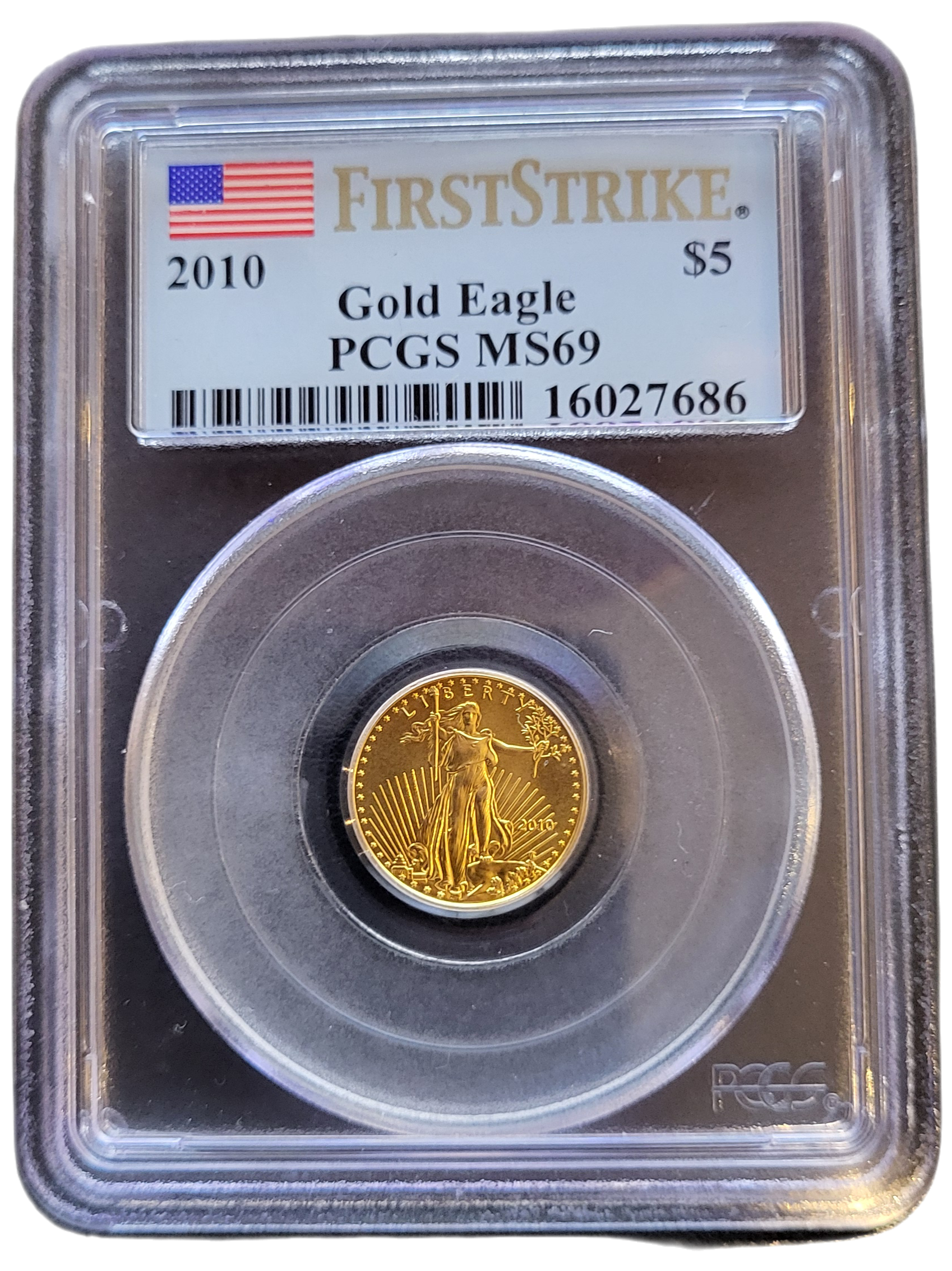 De Gouden American Eagle 1/10 oz 2010 PCGS MS69 First Strikeis een prachtige Amerikaanse munt uitgegeven door de U.S Mint. Op de voorkant staat een prachtige afbeelding van de Eagle, op de achterkant het portret van Walking Liberty. De munt is gegraded door PCGS en beoordeeld met een kwaliteitsscore van MS69 (munten kunnen een score krijgen van 1 t/m 70 waarbij 70 de hoogst mogelijke score is). De gouden American Eagles bestaat voor 91,67% uit goud, voor 3% uit zilver en voor 5,33% uit koper. Deze munt weegt 3,39 gram en bevat 3,11 gram aan goud, wat daarmee exact uitkomt op 1/10 ounce goud. De denominatie van deze munt (Face Value) is 5 dollars.
