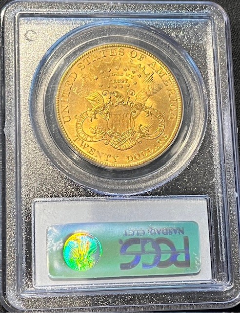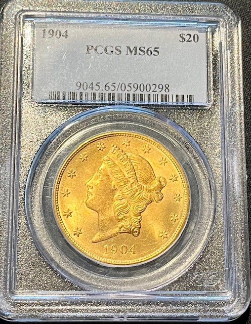Dit is een door PCGS gecertificeerde 20 dollar 1904 Liberty Head type 3. De door PCGS bepaalde kwaliteit is MS65. Zoals u kunt zien zijn er veel munten gecertificeerd. De totaal aantal geslagen munten zijn 6.256.699. Gezien deze munten met regelmaat als vervalsing worden aangetroffen, is het logisch dat de munt gecertificeerd wordt.