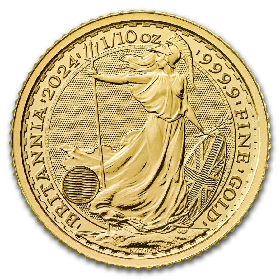 De Britannia 1/10 oz 2025 munten worden geproduceerd door de Britse Royal Mint. Deze munten zijn in Engeland wettig betaalmiddel (10 pond). De munten wegen 3,121 gram en bevatten 99,99% goud.