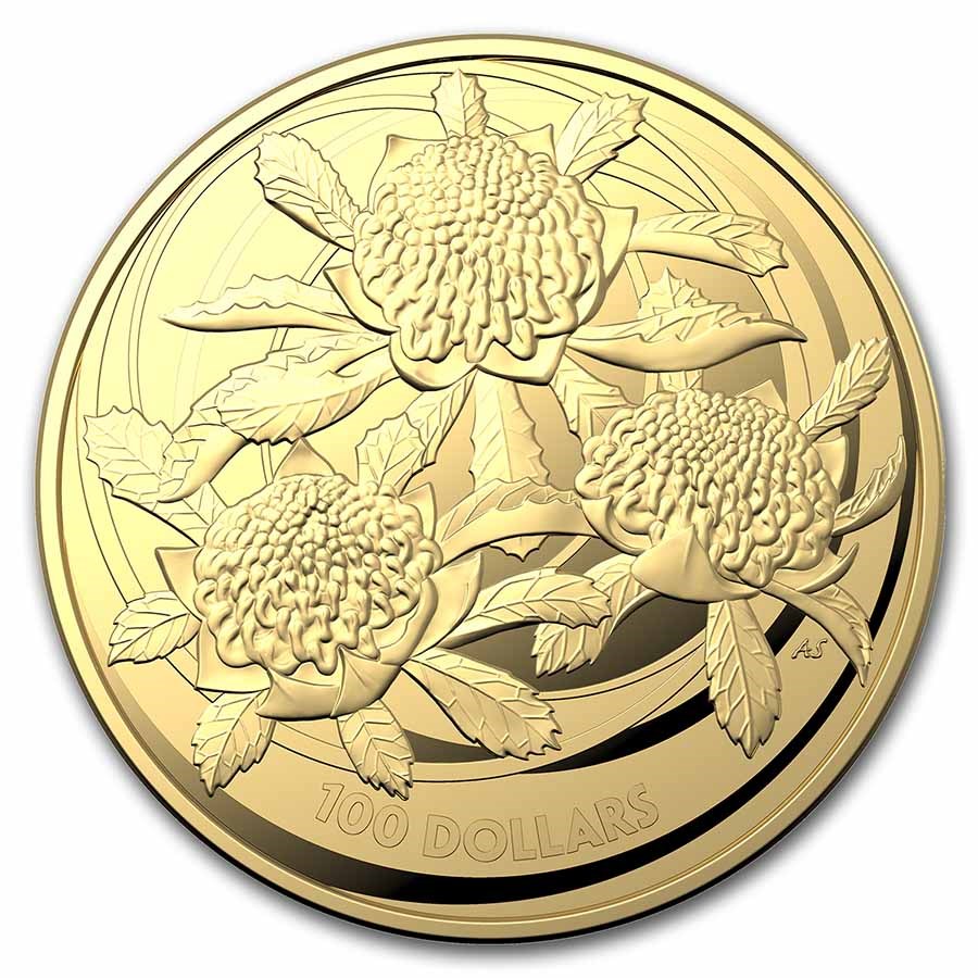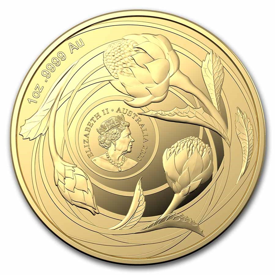 Deze gouden 1 ounce munt uit 2022 heeft een prachtige weergave van de wilde bloem genaamd de Waratah op beide zijden van de munt.
