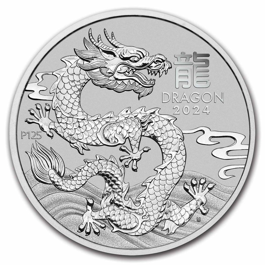 - Keerzijde: toont een Chinese draak die door de lucht zweeft. Ook opgenomen in het ontwerp is het Chinese karakter voor “draak”, de inscriptie “DRAGON 2024” en het muntteken “P125” van The Perth Mint, ter ere van hun 125e verjaardag.