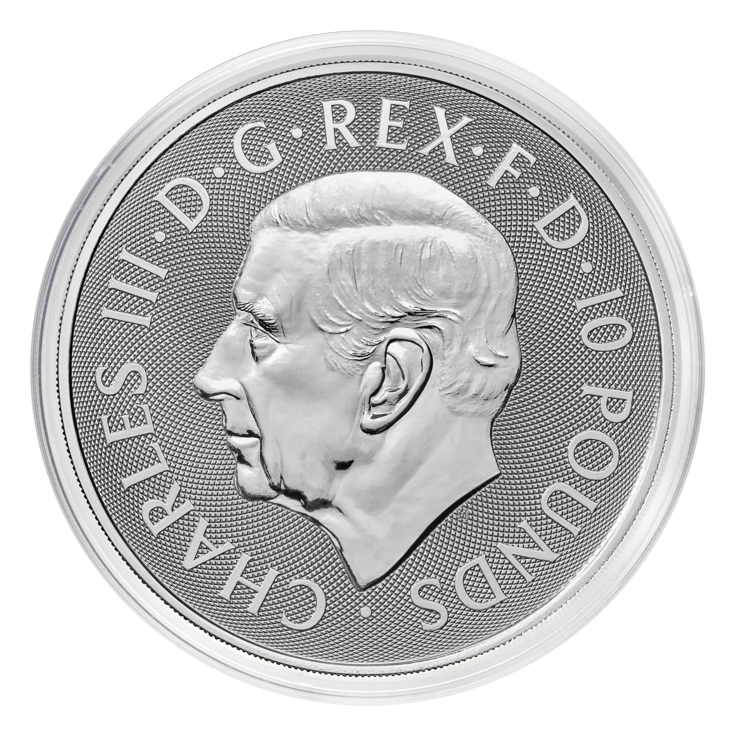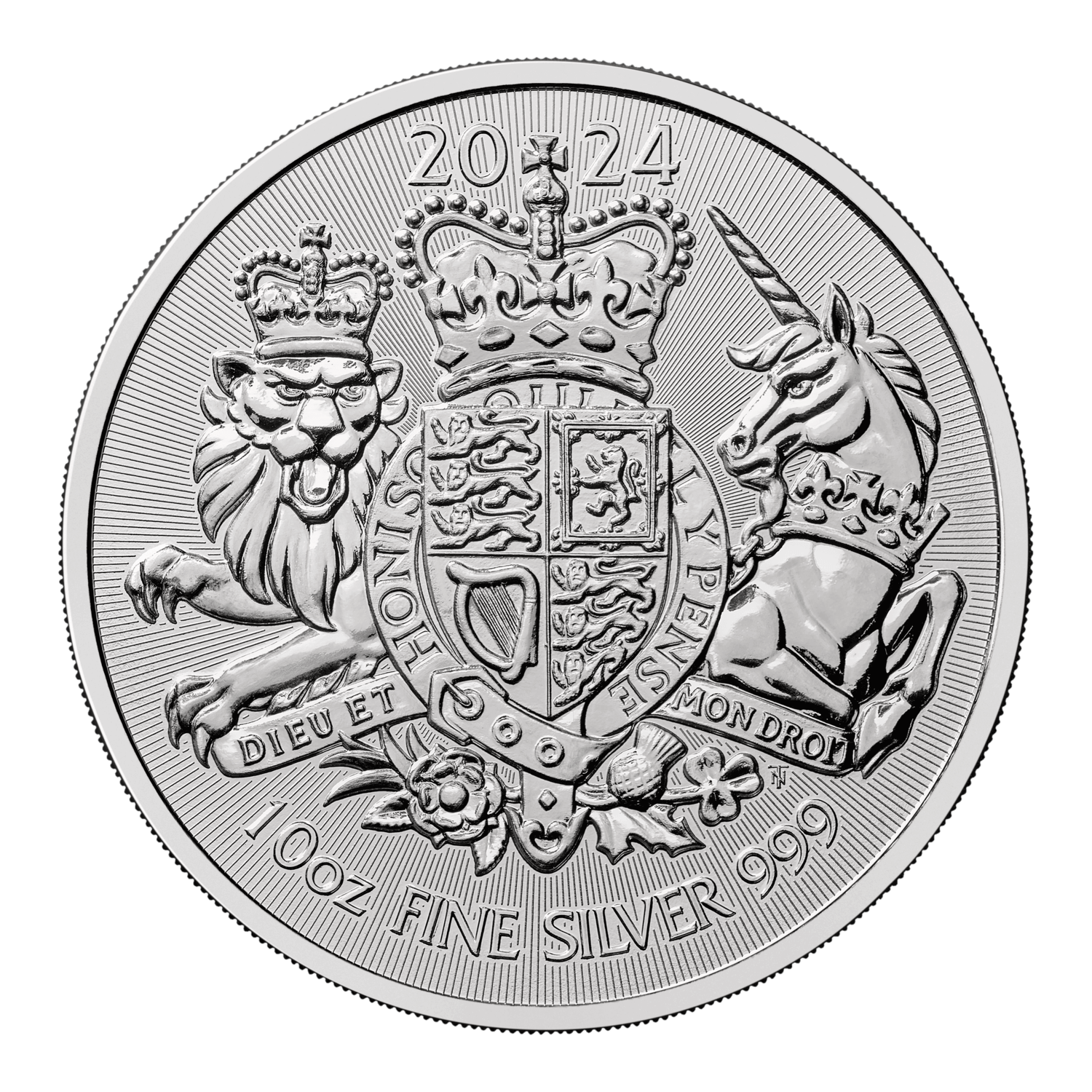 Deze Royal Arms 10 oz munt uit 2024 wordt uitgegeven door de Royal British Mint. De munten bevatten een zilver gehalte van 99,99% en wegen allen 10 Troy ounce = 311,1 gram.
