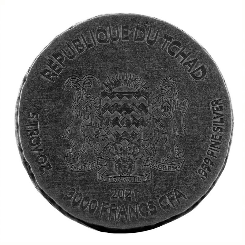 Deze prachtige munt, de Chad 5 oz Anubis 2021 met een kleine oplage van 5.000, is geproduceerd in opdracht van de Centrale Bank van Chad (Tjaad). De producent is de Scottsdale Mint. Deze munten zijn in Tjaad wettig betaalmiddel (CFA 3000). De munten wegen 155,5 gram en bevatten 99,9% zilver. De munt heeft een diameter van 42 mm en is 11.6 mm dik. De diameter is ongeveer vergelijkbaar met een 1 oz munt, maar de munt is stukken dikker!