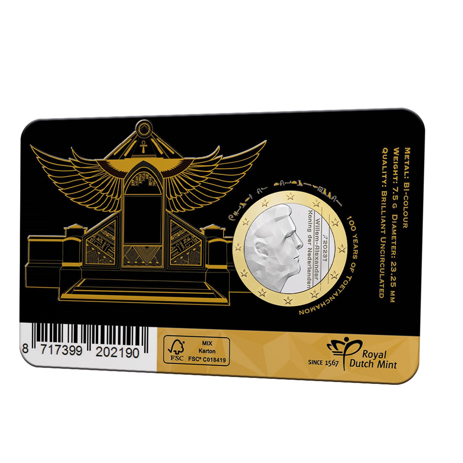 Om stil te staan bij de opening van het graf van Toetanchamon, lanceert de Koninklijke Nederlandse Munt een speciale uitgifte: een coincard met daarin een euro. Voor het eerst is bij de Koninklijke Nederlandse Munt een 1 euro munt in coincard te ontdekken. Deze verwijst naar de 100 jaar geleden dat het graf van de farao werd geopend. De munt steekt in een bijzonder toepasselijke coincard die de sfeer van het oude Egypte oproept. Rondom de munt zijn op de coincard de contouren van het bekende dodenmasker van Toetanchamon zichtbaar. Op de achtergrond staan Egyptische hiërogliefen afgebeeld.