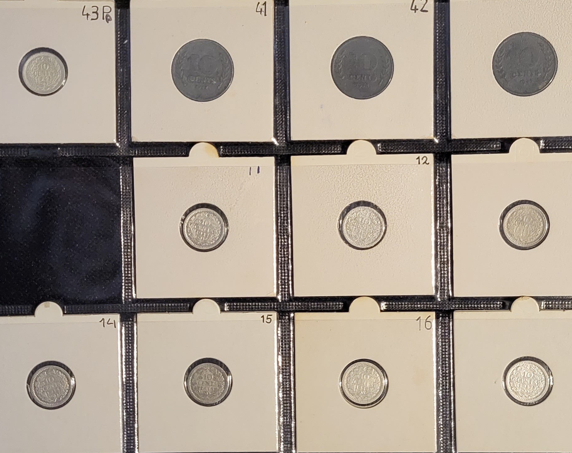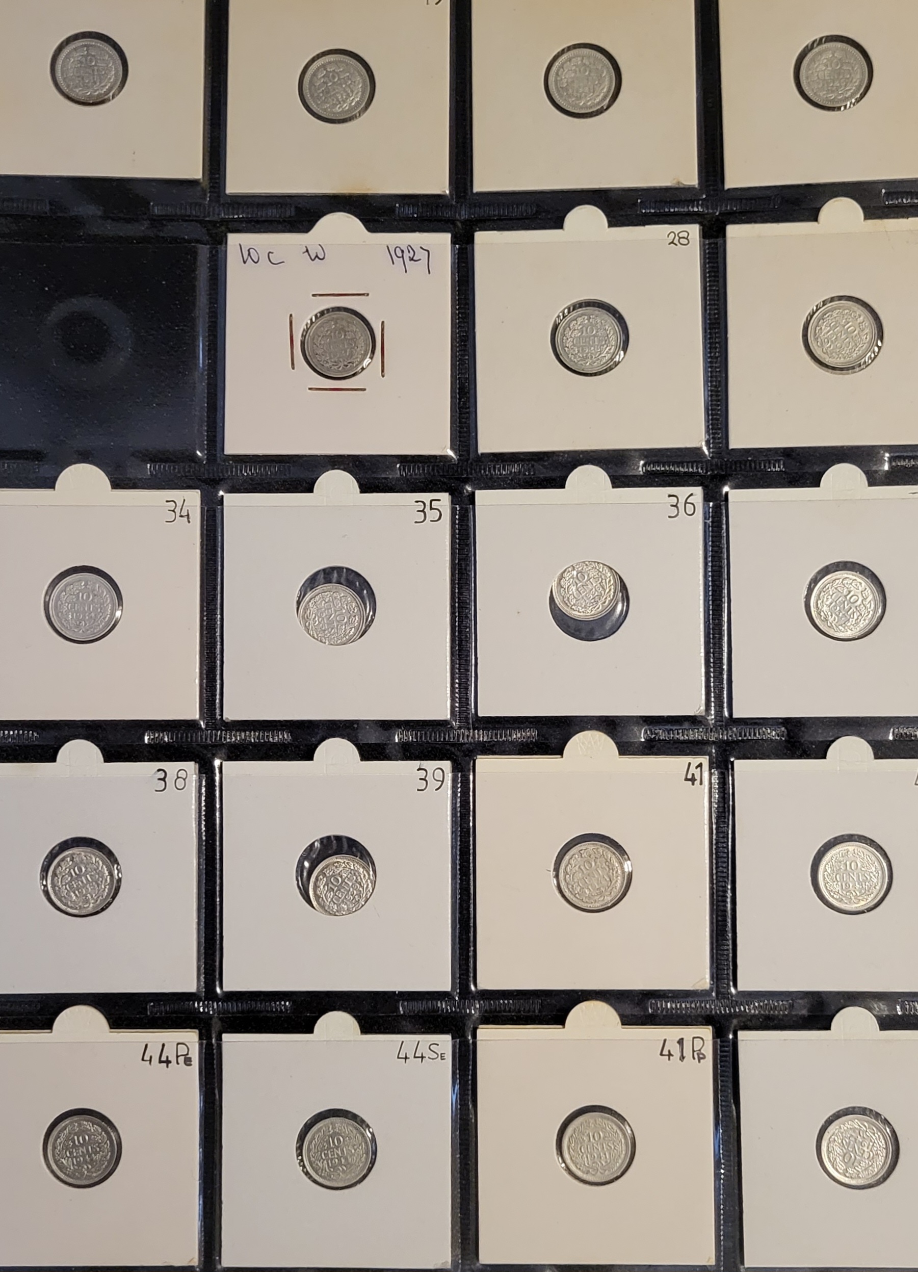 Wilhelmina serie 10 cent 1911 t/m 1944 inclusief zink (30 stuks) exclusief 1926 geslagen onder Wilhelmina en tijdens de Duitse bezetting. Inhoud, 21 zilveren dubbeltjes 1911 t/m 1941, 3 verschillende zinken dubbeltjes en de 6 zilveren dubbeltjes geslagen overzee in de USA.