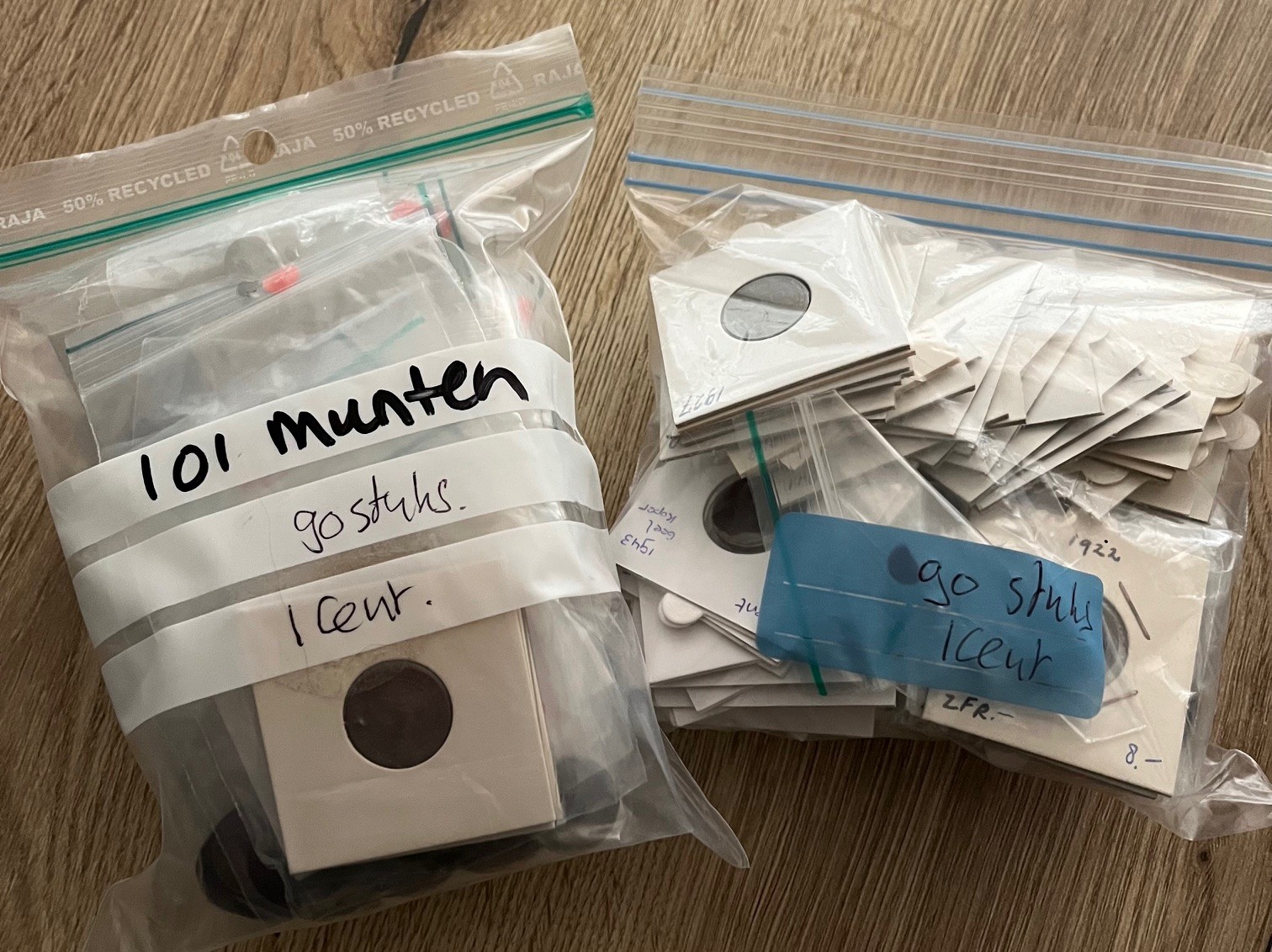 Een zak vol met 90 1 cent munten van Nederland. Van 1878/1943, diverse jaren in diverse kwaliteiten (niet alleen 1941 jaar), deels in munthouder, deels los.