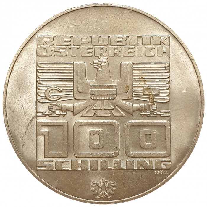 Dit product betreft de zilveren Oostenrijkse 100 Schilling. Deze zilveren Oostenrijkse 100 Schilling munten zijn in de jaren 1974-1979 uitgegeven. De munten wegen 24 gram, en bevatten 64% zilver. Per munt zit er 15.36 gram zilver in. Afbeelding hier getoond is ter indicatie, jaren en afbeeldingen variëren per order.