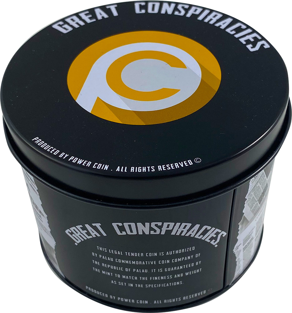Op de achterkant van de munt staat een gedetailleerd beeld van een buitenaards wezen in een ruimteschip, van bovenaf gezien. De alien zit waarschijnlijk gevangen in Area 51. Linksboven op de achterkant staan de inscripties: “AREA 51” – de naam van de munt en “MMXX” – het jaar van uitgifte, geschreven in Romeinse cijfers. Op de voorzijde van de munt staat een prachtig patroon, het wapen van Palau en de inscripties: “GREAT CONSPIRACIES” – de naam van de serie en “NOVUS ORDO SECLORUM” – zin die verband houdt met de complottheorie van de Nieuwe Wereldorde.