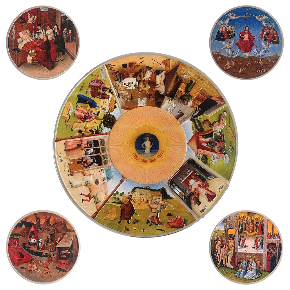 Deze set van 4×1/2 oz zilveren munten en 1×3 oz zilveren munt is een reproductie van “The Seven Deadly Sins” van Hieronymus Bosch. De munten zijn van Proof kwaliteit, voorzien van Smart minting Reliëf en levendige kleuren. De 3 oz munt is hol met een glanzend oppervlak. De munten worden geleverd in een houten kist die is ontworpen als een oud boek, samen met een certificaat van echtheid. Gelimiteerde oplage van 300 stuks!!