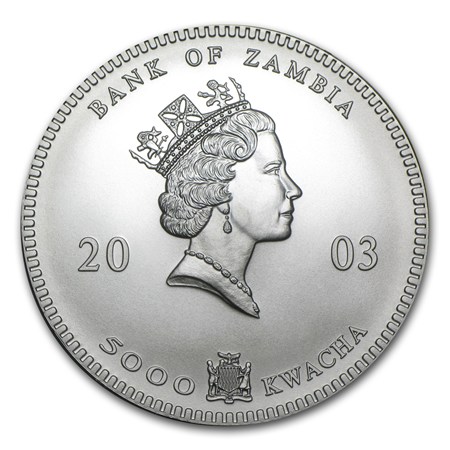 De Zambia (Sambia) Olifant is uitgegeven tussen 1999-2003. Het is ook van de weinige zilveren 1 ounce munten met een Afrikaanse achtergrond! De oplage van de munt is ons onbekend, maar de munten zijn wel erg lastig te verkrijgen. De munten zijn verschenen als onderdeel van de African Wildlife serie. Vanaf 2004 vallen de munten van de Somalische Olifant onder de African Wildlife serie. De munten uit Zambia, zijn wettig betaalmiddel in Zambia, voor een waarde van 5.000 Kwacha.